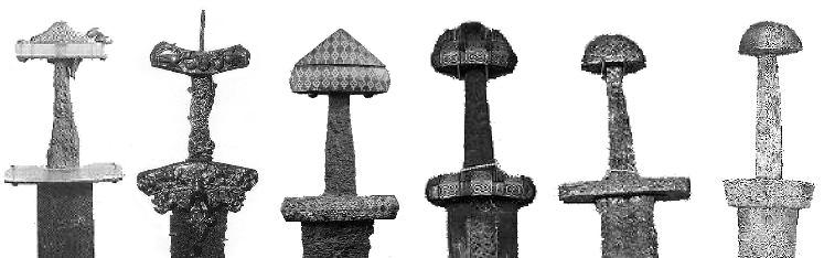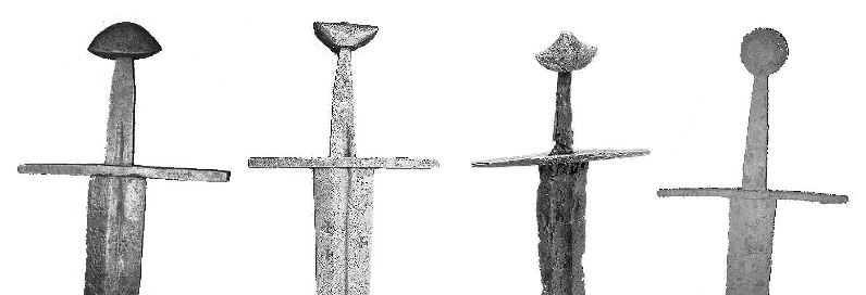 Die Schwerter des frühen Mittelaltes unterscheiden sich in der Form kaum vom der Antike / der römischen Spatha: reine Hiebwaffen mit Klingen von kaum mehr als 80cm Länge, der einhändige Griff stabilisiert das Handgelenk. Der Knauf kennt eine grössere Formenvielfalt (Wikingerschwerter). Erst in normannischer Zeit (um 1000) bildet sich aus dem vorderen Teil des Griffs eine Parierstange aus (Schutz der Schwerthand bei Abwehr von Schlägen mit der Klinge). In den Wikinger-Schwertern setzt sich die Hohlkehle durch, eine Rille auf der Klingenfläche, die bei gleicher Stabilität das Gewicht (und den Metallbedarf) verringert.