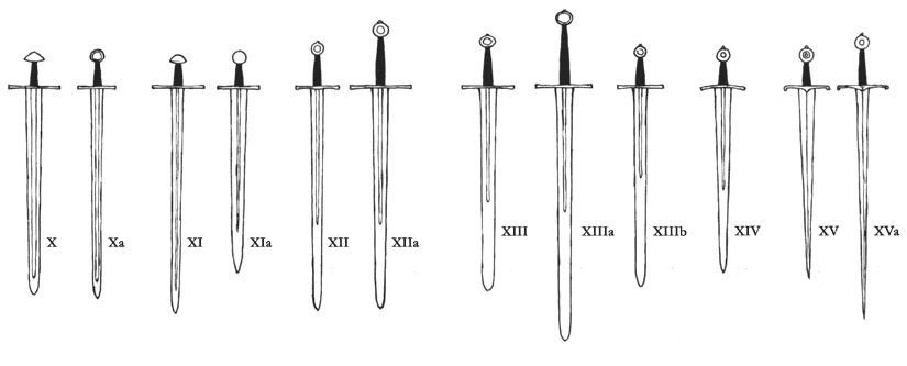 Typ XII: breite, flache Klinge, Hohlkehle weniger als 2/3 der Klingenlänge; einhändig gegriffen; sich verjüngende Klinge; gebräuchlich während des ganzen MA. Subtyp XIIa: wie Typ XII, aber mit längerem Griffholz; gebräuchlich im 13. und 14. Jh.