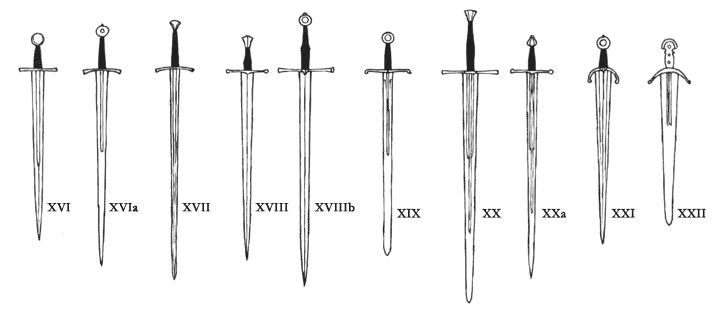 Typ XVI: deutlicher Rauten-Querschnitt (Panzerbrecher); Hohlkehle über 1/2 Klingenlänge, Klinge ca. 70-80cm. Subtyp XVIa: längere Klinge, kürzere Hohlkehle; langes Griffholz.